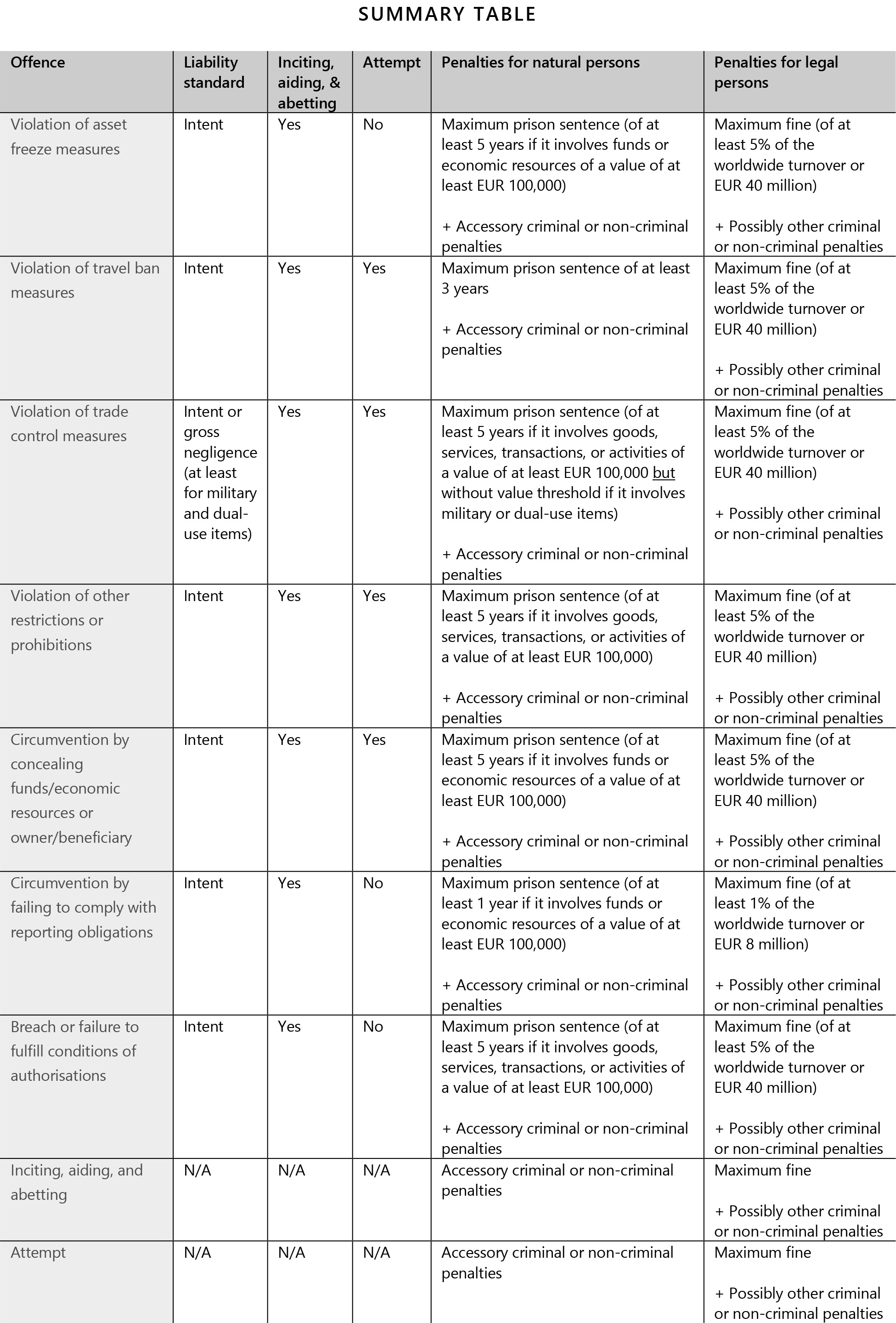 • For natural persons: maximum prison sentences,5 of at least one to five years for certain sanctions violations, and accessory criminal or non-criminal penalties.6